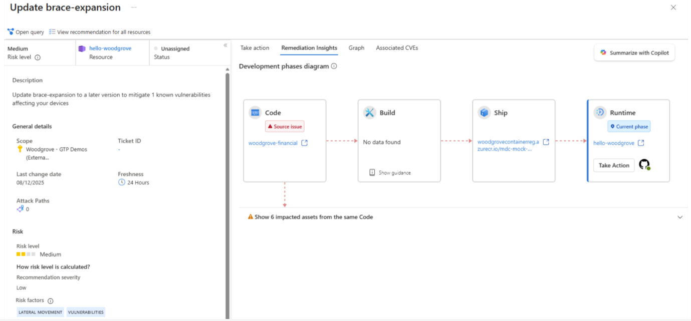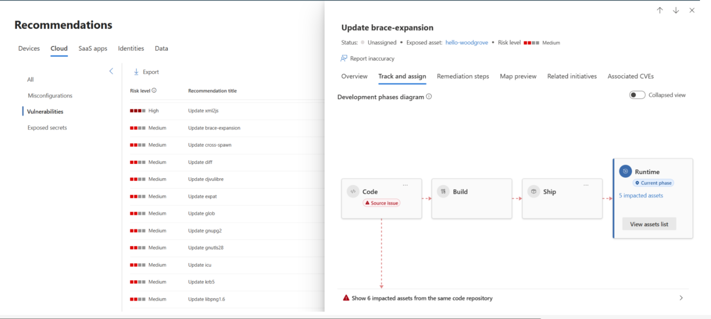 - L'elenco mostra gli asset interessati dalla stessa origine. Include gli asset nell'ambiente cloud o nell'ambiente di codice. La correzione del problema nell'origine può influire su tutti gli asset interessati dai processi CI/CD automatizzati o dalla distribuzione manuale del nuovo codice.