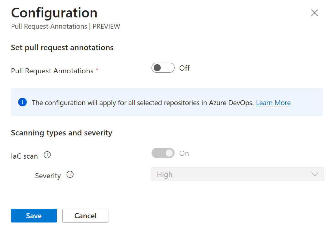 Esempio di abilitazione delle annotazioni della richiesta pull del Progetto di Azure DevOps per la categoria IaC con una gravità minima di livello Alto usando lo strumento zona di disponibilità CLI.