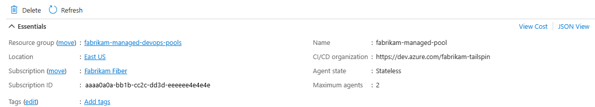 - Visualizzare le informazioni di configurazione per il pool, ad esempio Nome, organizzazione Di Azure DevOps, Stato agente e Agenti massimi.