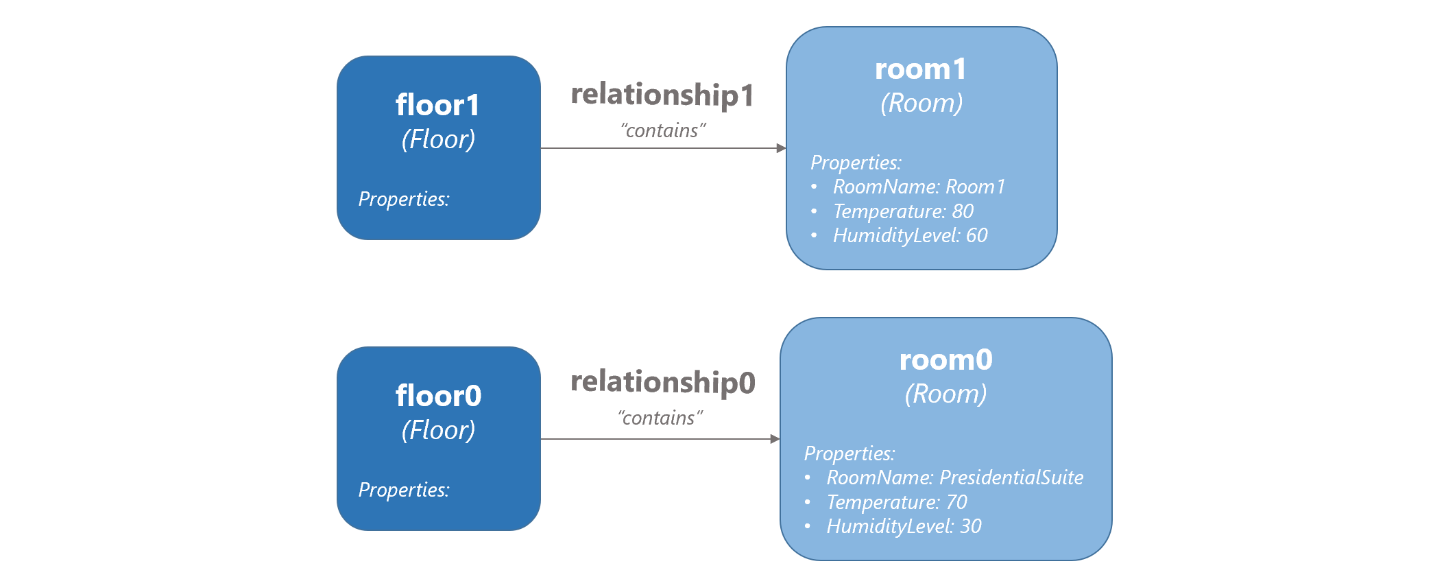 I tipi di relazioni che è possibile creare da un gemello a un altro vengono definiti all'interno dei modelli caricati in precedenza. La definizione del modello per Floor specifica che i piani possono avere un tipo di relazione denominata contains, che consente di creare una relazione di tipo contains da ogni gemello Floor alla stanza corrispondente che contiene.