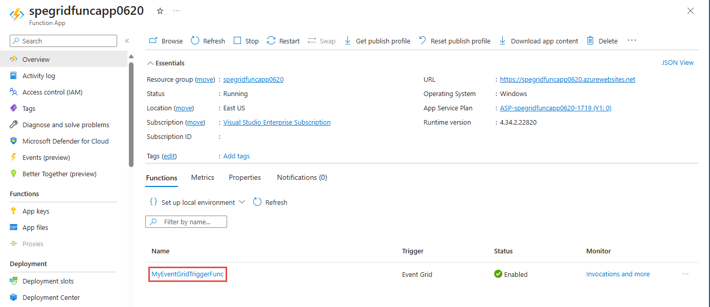 È stato attivato l'evento e Griglia di eventi ha inviato il messaggio all'endpoint configurato al momento della sottoscrizione. È ora possibile verificare se la funzione l'ha ricevuto.