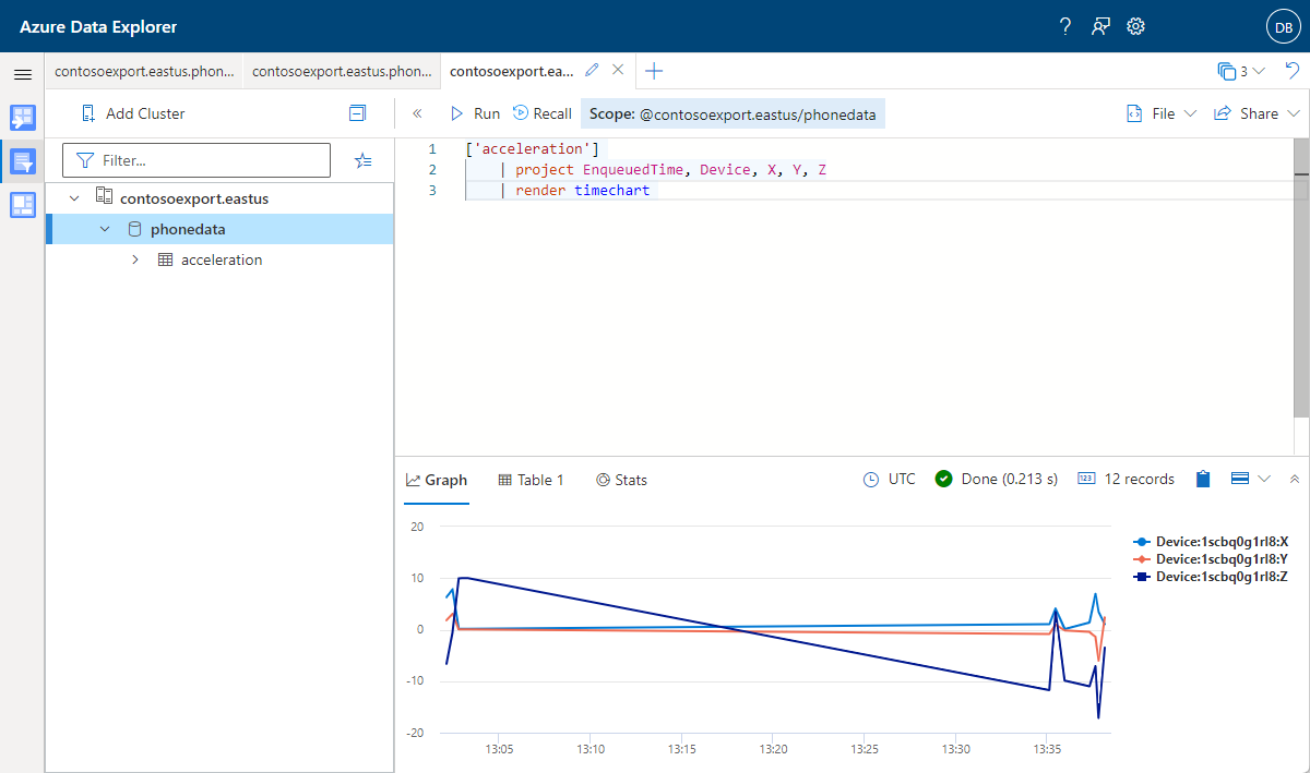 Scope:yourclustername.eastus/phonedata.In Esplora dati di Azure aprire una nuova scheda e incollare la query Kusto seguente e quindi selezionare Esegui per tracciare i dati di telemetria dell'accelerometro: