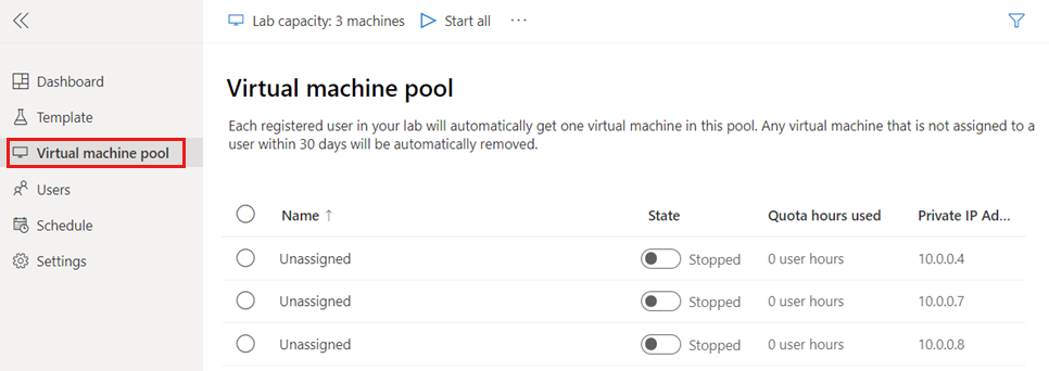 Al momento le macchine virtuali lab sono arrestate e non assegnate, il che significa che non sono assegnate a utenti del lab specifici.
