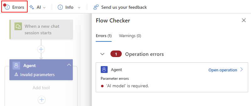 Se si tenta di salvare il flusso di lavoro ora, la barra degli strumenti della finestra di progettazione mostra un punto rosso sul pulsante Errori . La finestra di progettazione avvisa l'utente di questa condizione di errore perché il ciclo dell'agente richiede l'installazione prima di poter salvare le modifiche. Tuttavia, non è necessario configurare il ciclo operativo dell'agente ora. È possibile continuare a creare il flusso di lavoro. Ricordarsi di configurare il ciclo dell'agente prima di salvare il flusso di lavoro.
