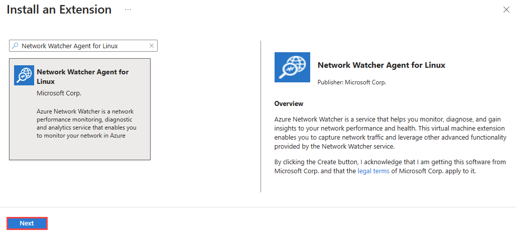 Nella casella di ricerca di Installa un'estensione immettere Network Watcher Agent per Linux. Selezionare l'estensione dall'elenco e selezionare Avanti.