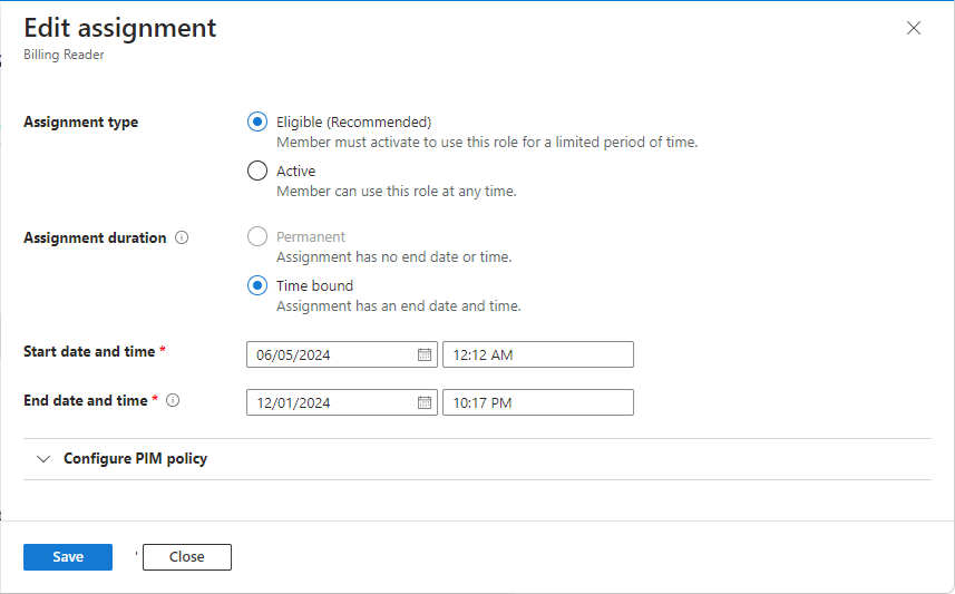 Gli utenti con assegnazioni idonee e/o con vincoli di tempo devono avere una licenza valida. Se non si vuole usare la funzionalità PIM, selezionare il tipo di assegnazione Disponibile e le opzioni di durata dell'assegnazione Permanente. Queste impostazioni creano un'assegnazione di ruolo in cui il principale ha sempre autorizzazioni per quel ruolo.