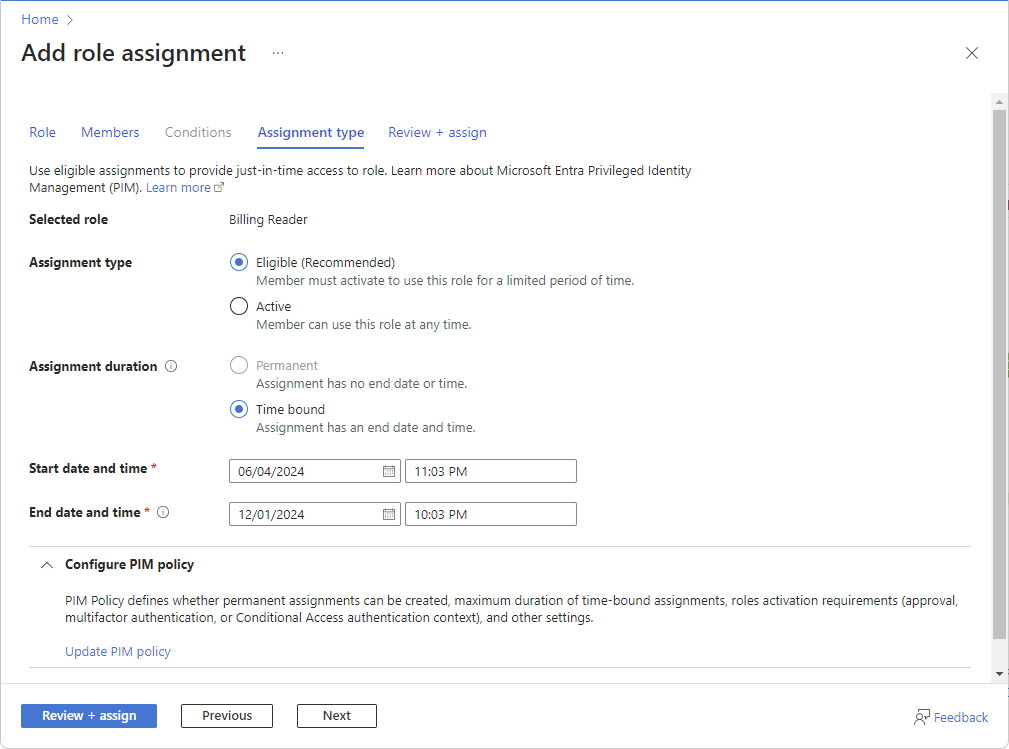 Se si dispone di una licenza di Microsoft Entra ID P2 o Microsoft Entra ID Governance, Microsoft Entra Privileged Identity Management (PIM) è integrato nei passaggi di assegnazione dei ruoli. Ad esempio, è possibile assegnare ruoli agli utenti per un periodo di tempo limitato. È anche possibile rendere gli utenti idonei per le assegnazioni di ruolo in modo che debbano attivarsi per usare il ruolo, ad esempio l'approvazione della richiesta. Le assegnazioni di ruolo idonee forniscono l'accesso just-in-time a un ruolo per un periodo di tempo limitato.
