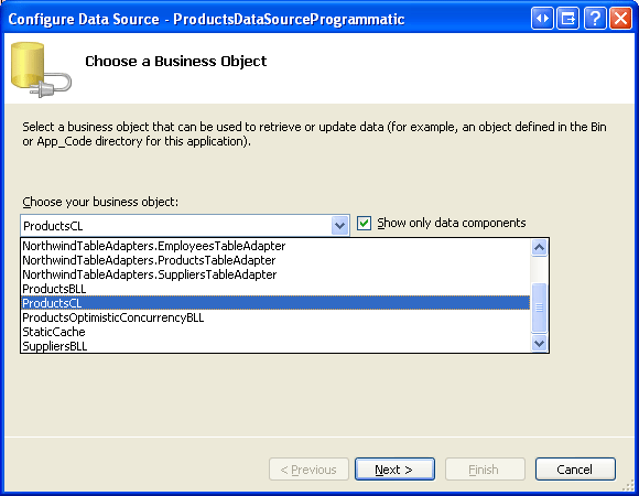 Figura 11: Configurare ObjectDataSource per l'uso della classe (ProductsCL a dimensione intera)