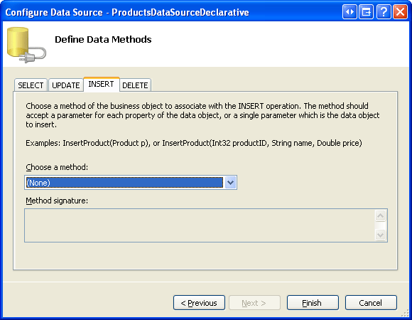 Configurare ObjectDataSource per usare la ProductsBLL classe e impostare l'elenco a discesa nella scheda SELECT su GetProducts(). Nella scheda UPDATE scegliere l'overload UpdateProduct con tre parametri di input : productName, unitPricee productID. Impostare gli elenchi a discesa su (Nessuno) nelle schede INSERT e DELETE.