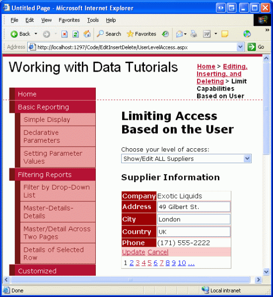 La maggior parte dei siti che forniscono account utente deve personalizzare l'interfaccia di modifica dei dati in base all'utente connesso. Gli utenti amministratori possono essere in grado di eliminare e modificare qualsiasi record, mentre gli utenti non amministrativi possono essere limitati solo all'aggiornamento o all'eliminazione di record creati. Indipendentemente dallo scenario, i controlli Web dati, ObjectDataSource e le classi livello di logica di business possono essere estesi per aggiungere o negare determinate funzionalità in base all'utente connesso. In questa esercitazione è stato illustrato come limitare i dati visualizzabili e modificabili a seconda che l'utente fosse associato a un determinato fornitore o se lavorasse per la nostra azienda.