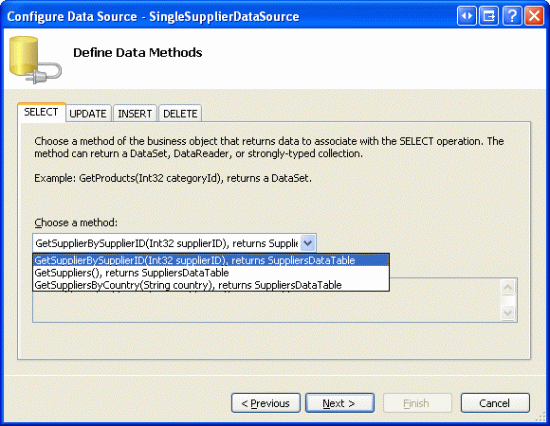 Aggiungere un nuovo ObjectDataSource alla pagina, denominandolo SingleSupplierDataSource. Dallo smart tag, clicca sul collegamento "Configura origine dati" e configura in modo che usi il metodo della classe SuppliersBLL. Come per AllSuppliersDataSource ObjectDataSource, il SingleSupplierDataSource ObjectDataSource e il metodo Update() della classe SuppliersBLL sono mappati al metodo UpdateSupplierAddress.