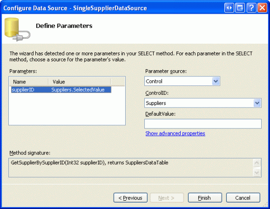 Figura 7: Configurare ObjectDataSource per l'uso SingleSupplierDataSource del metodo (GetSupplierBySupplierID(supplierID) a dimensione intera)
