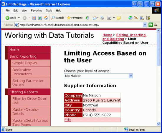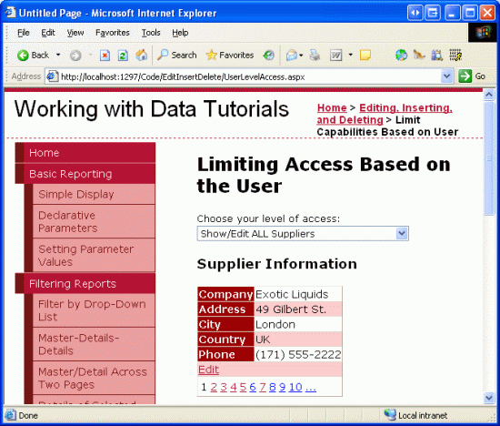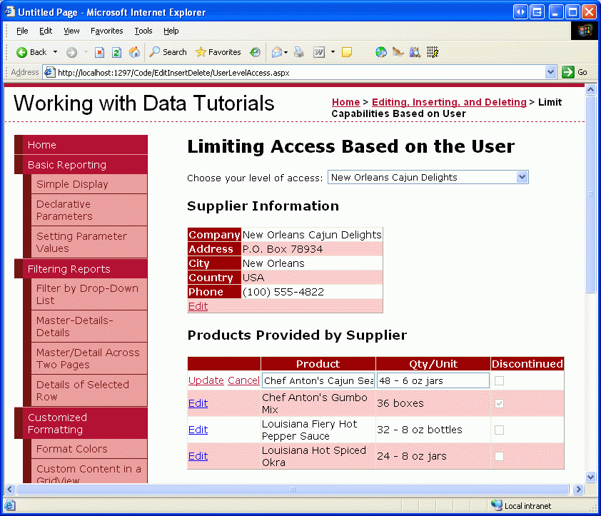 In questa esercitazione si esaminerà come modificare dinamicamente le funzionalità di modifica dei dati in base all'utente in visita. In particolare, verrà creata una pagina che visualizza le informazioni sui fornitori in un controllo DetailsView modificabile insieme a un controllo GridView che elenca i prodotti forniti dal fornitore. Se l'utente che visita la pagina proviene dalla nostra azienda, può: visualizzare le informazioni dei fornitori; modifica il loro indirizzo; e modificare le informazioni relative a qualsiasi prodotto fornito dal fornitore. Se, tuttavia, l'utente proviene da una determinata società, può solo visualizzare e modificare le proprie informazioni sull'indirizzo e modificare solo i prodotti che non sono stati contrassegnati come sospesi.