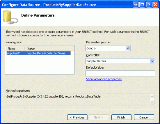 Viene richiesto di selezionare l'origine del parametro per il GetProductsBySupplierID(supplierID) parametro di input del supplierID metodo. Poiché si vogliono visualizzare i prodotti per il fornitore selezionato in DetailsView, usare la SuppliersDetails proprietà del SelectedValue controllo DetailsView come origine del parametro.