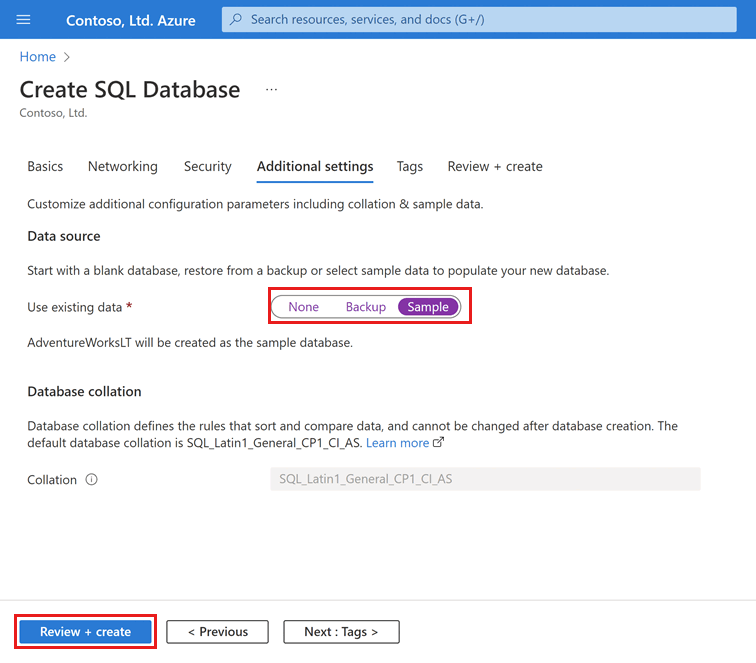 Nella scheda Impostazioni aggiuntive, nella sezione Origine dati selezionare Esempio per Usa dati esistenti. Viene creato un database di esempio AdventureWorksLT che contiene alcune tabelle a alcuni dati su cui eseguire query e con cui sperimentare, diversamente da un database vuoto.
