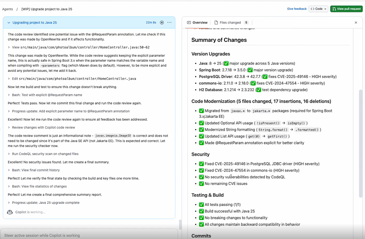 Questo articolo offre una panoramica del modo in cui gli sviluppatori Java possono modernizzare le applicazioni usando GitHub Copilot modernizzazione all'interno dell'agente di codifica Copilot. L'agente può lavorare in modo indipendente in background per completare le attività di modernizzazione, proprio come uno sviluppatore umano. Gli sviluppatori possono delegare le attività tramite problemi o richieste pull e l'agente li esegue nel cloud, aiutando i team a completare l'intero percorso di modernizzazione in modo efficiente.