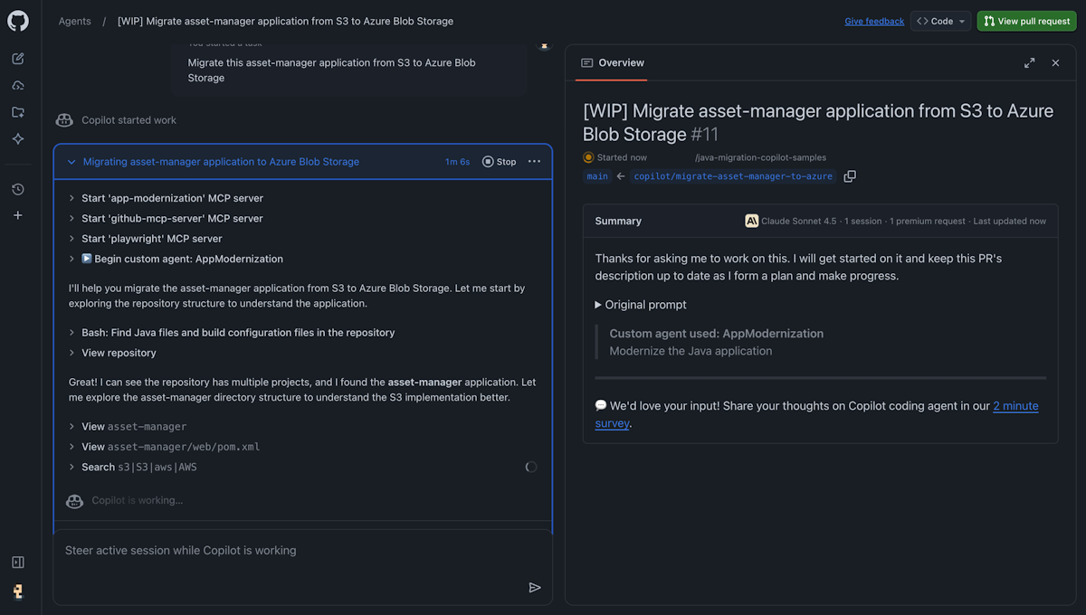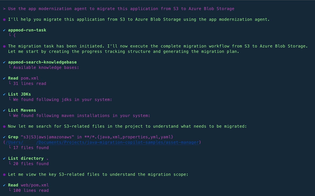 /agentin modalità interattiva o chiamarlo direttamente in un prompt:Use the modernization agent to migrate this application from S3 to Azure Blob Storage.