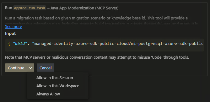 chat.tools.autoApprovedi Visual Studio Code pertrueapprovare automaticamente tutti gli strumenti. È anche consigliabile configurarechat.agent.maxRequestsper128ridurre il numero di passaggi che richiedono la conferma per continuare.Per Intellij IDEA, è possibile selezionare il pulsante Continua o aggiornare le impostazioni, selezionare la finestra Strumenti> di configurazionedi GitHub Copilot e quindi selezionare Approva automaticamente. È anche consigliabile abilitare le annotazioni dello strumento MCP attendibili e aumentare le richieste massime a