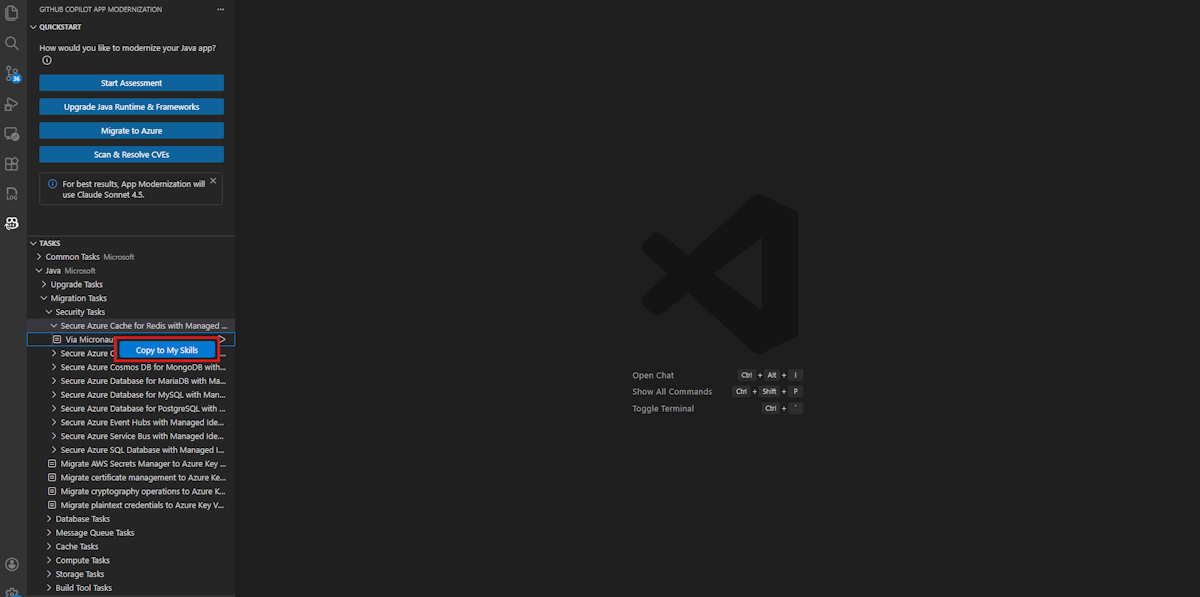 Se in precedenza sono state utilizzate attività personalizzate, archiviate nei dati utente del progetto o di Visual Studio Code, l'estensione le migra automaticamente alla nuova posizione .github/skills/ del progetto al primo caricamento.