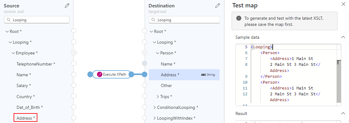 Questo esempio usa un payload di test e produce correttamente risultati con più nodi Indirizzo perché il nodo Indirizzo di origine esiste in una matrice Dipendente, mentre il nodo Indirizzo di destinazione esiste in una matrice Persone.