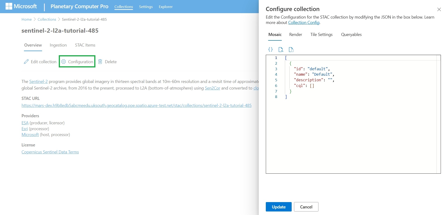 Viene visualizzato il pannello Configura raccolta e sono disponibili schede per Mosaic, Render, Tile Settings e Queryables, ognuna delle quali è possibile definire in formato JSON. È possibile scrivere il proprio codice JSON o caricare e modificare un modello.