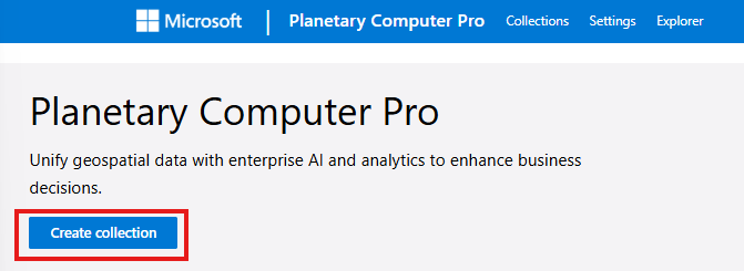 Per creare una nuova raccolta STAC, aprire l'interfaccia Web GeoCatalog selezionando il collegamento URI GeoCatalog nella pagina Panoramica delle risorse nel portale di Azure. Dopo aver aperto l'interfaccia Web, selezionare il pulsante Crea raccolta :