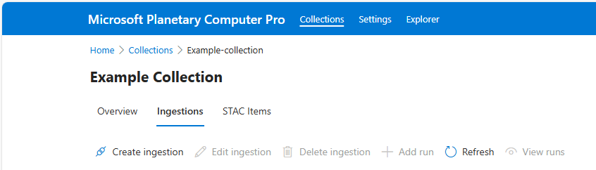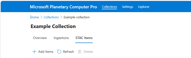 Data una raccolta STAC preesistente all'interno di un GeoCatalog, gli utenti possono inserire elementi STAC nuovi o aggiornare gli elementi STAC esistenti e i relativi asset associati usando l'interfaccia Web di Planetary Computer Pro o l'API. A differenza della funzionalità di inserimento bulk di Planetary Computer Pro, l'inserimento di singoli elementi è destinato a importazioni o aggiornamenti a bassa latenza rispetto a migrazioni di dati di grandi dimensioni. Per altre informazioni sull'inserimento in blocco, consultare Aggiungere elementi STAC a una raccolta.
