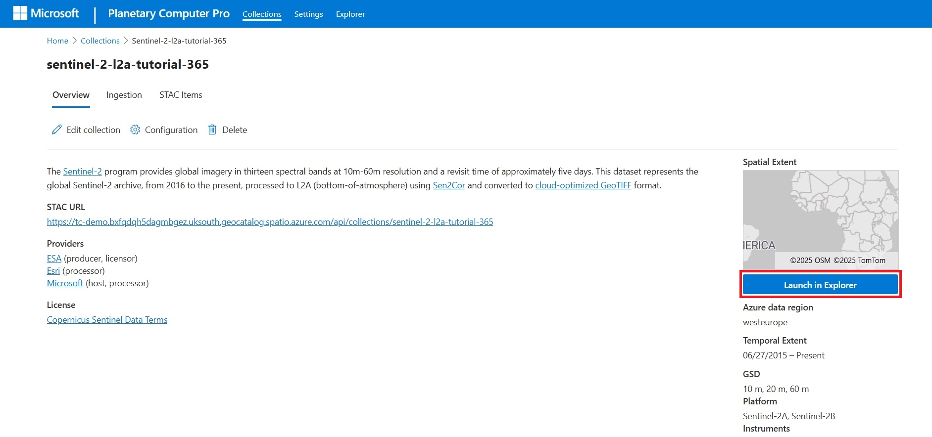 Nella scheda Panoramica della raccolta, selezionare Avvia in Esplora sul lato destro sotto la mappa delle estensioni spaziali. In questo modo viene caricata la raccolta in Explorer.