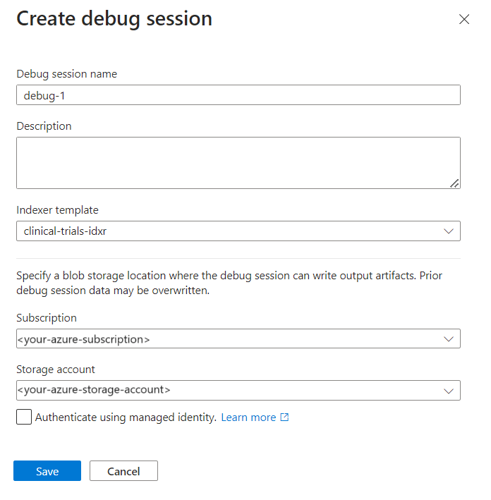 Viene aperta una sessione di debug nella pagina delle impostazioni. È possibile apportare modifiche alla configurazione iniziale ed eseguire l'override di tutte le impostazioni predefinite. Una sessione di debug funziona solo con un singolo documento. L'impostazione predefinita consiste nell'accettare il primo documento nella raccolta come base delle sessioni di debug. È possibile scegliere un documento specifico di cui eseguire il debug specificando l'URI in Archiviazione di Azure.