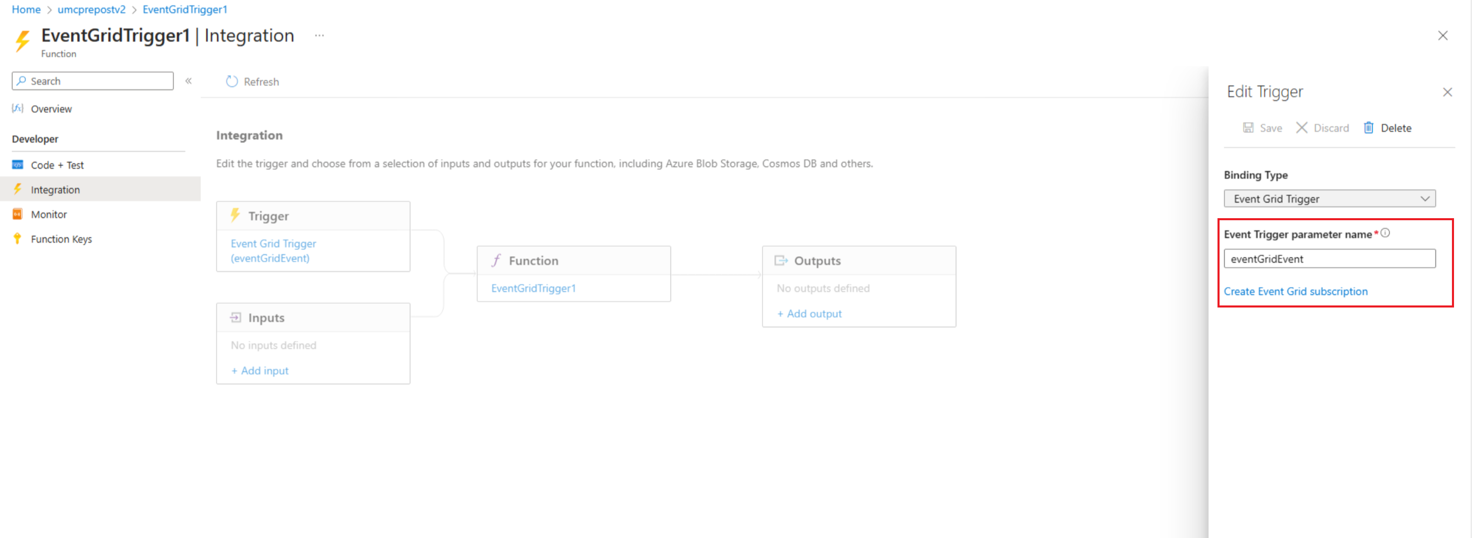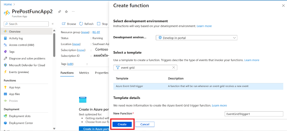 Dopo aver creato l'app per le funzioni, passare alla risorsa, passare a Panoramica e quindi selezionare Crea nel portale di Azure.