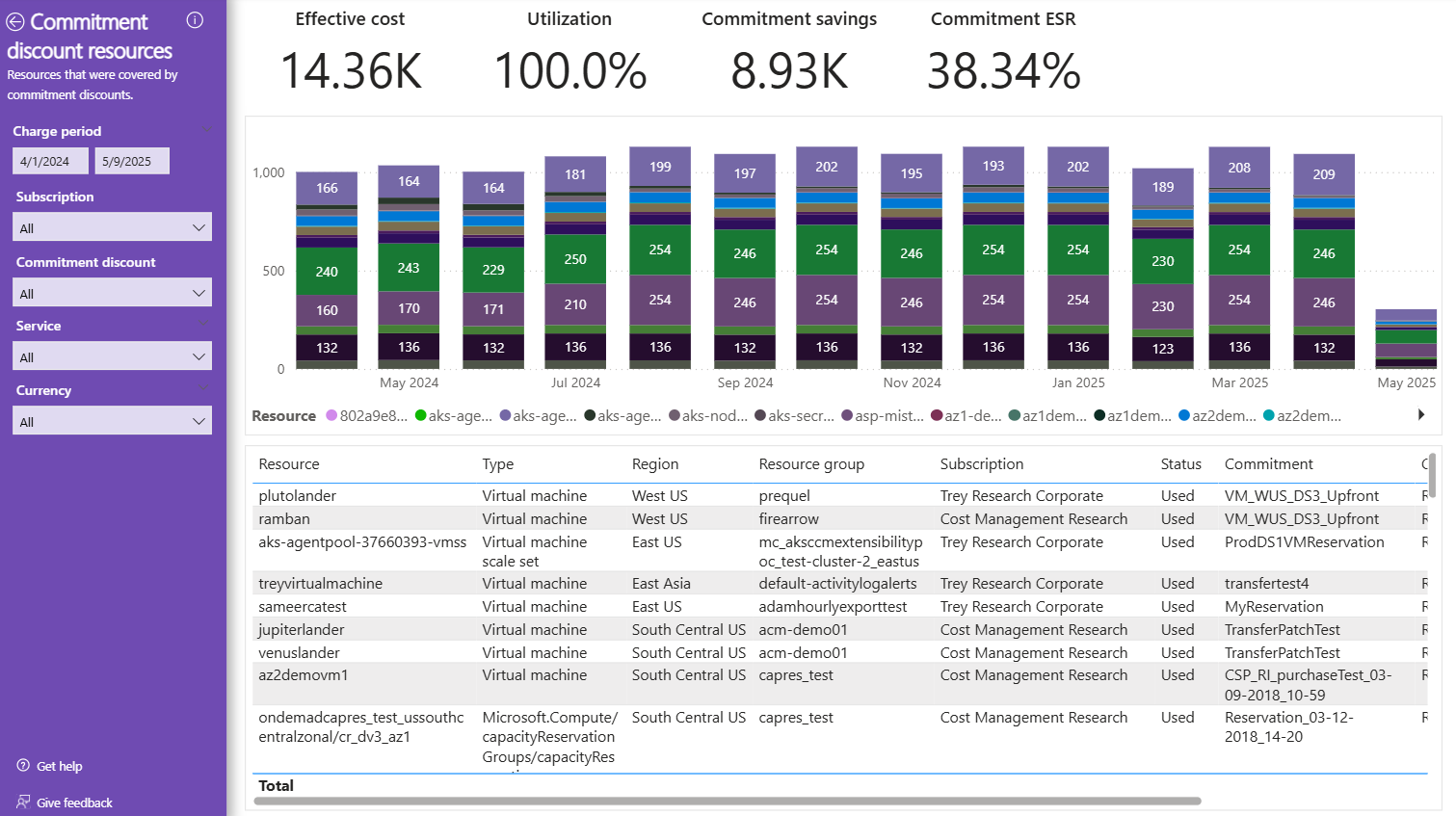 Il grafico suddivide il costo effettivo degli sconti relativi all'impegno per risorsa nel tempo. La tabella mostra l'utilizzo, il costo e il risparmio per l'intero periodo. Per visualizzare le risorse per un singolo sconto sull'impegno nel grafico, impostare i filtri applicabili a sinistra o usare la funzionalità "Drill-through" da un'altra pagina.