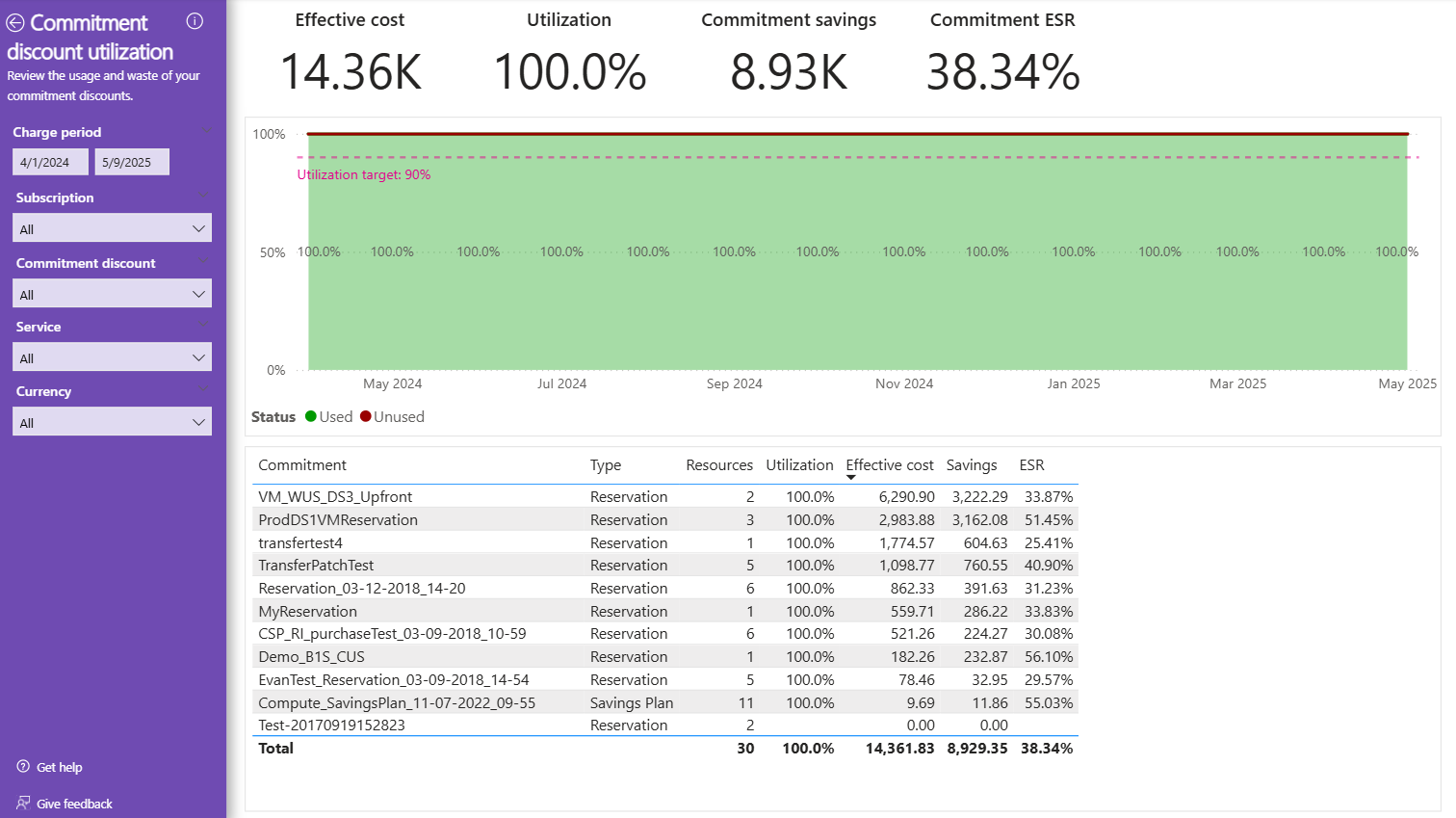 La pagina Utilizzo sconto impegno fornisce un riepilogo dell'utilizzo degli sconti per l'impegno visualizzando il costo totale di utilizzo coperto diviso per il costo totale di sconto di impegno (ammortizzato) per il periodo.