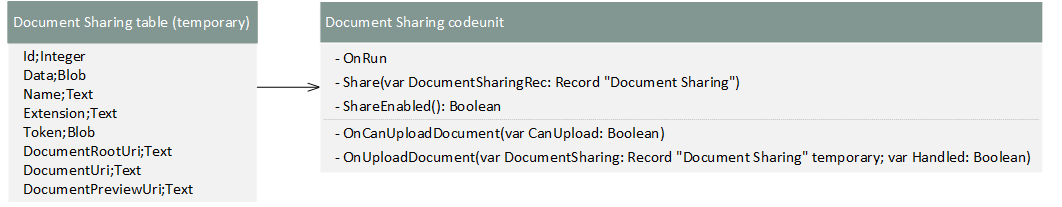 | Codeunit | 9560 | Document Sharing | Performs the document sharing. It uses the table 9560 Document Sharing as its source, and must be ran with a valid temporary record from the table. |
