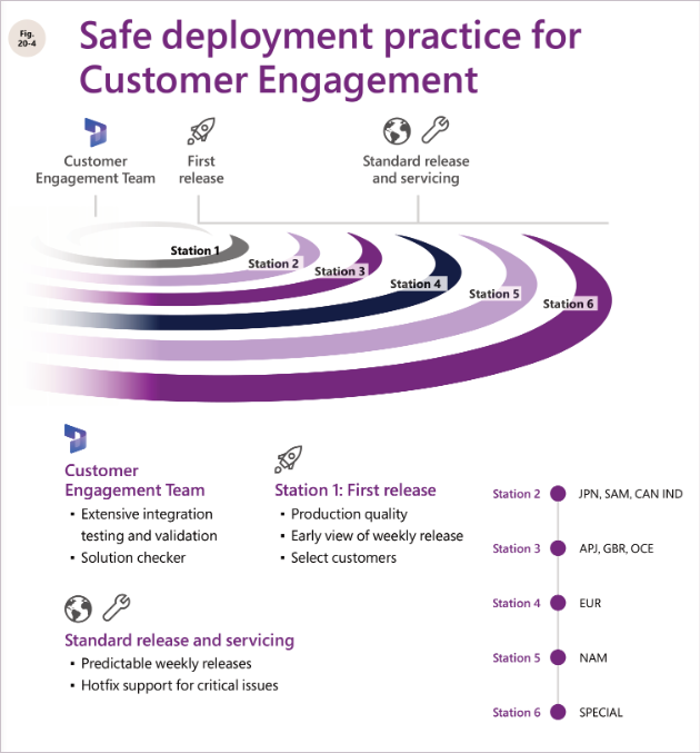 For customer engagement apps and Power Platform releases and updates, we use a station-based deployment plan, as shown in the following diagram: