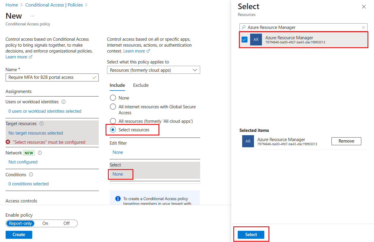 In Risorse di destinazione>(in precedenza app cloud)>Includi>Seleziona risorse, scegliere Azure Resource Manager e quindi selezionare la risorsa.