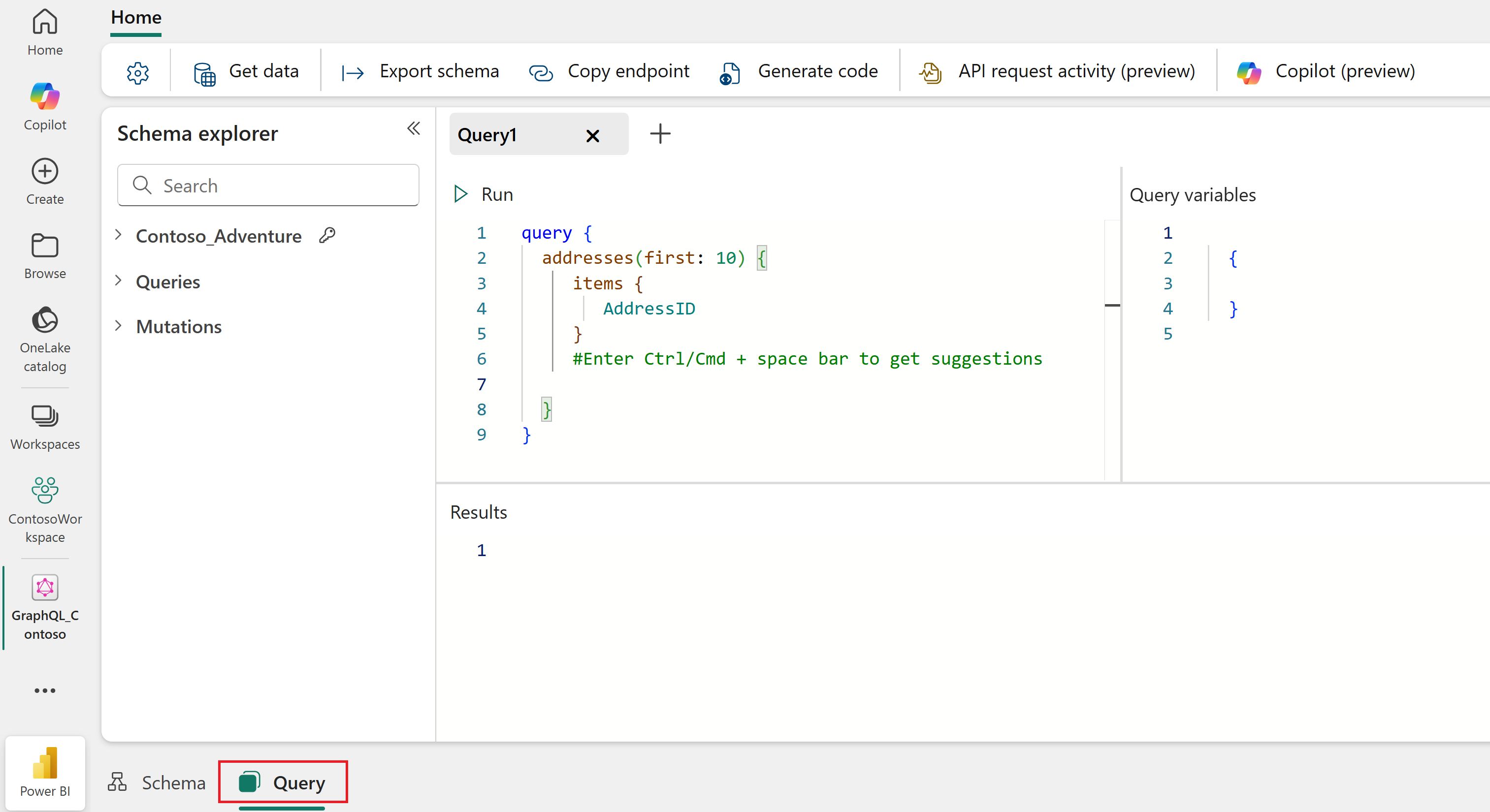 Usare l'editor ogni volta che è necessario sviluppare, testare o risolvere problemi di query GraphQL in modo interattivo contro le origini dati di Fabric.