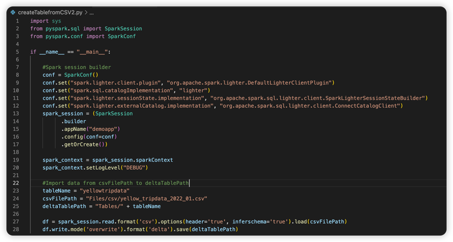 Il file denominato sparkconf.py contiene un frammento di codice da aggiungere per configurare l'oggetto SparkConf. Per abilitare il debug remoto, assicurarsi che l'oggetto SparkConf sia configurato correttamente. L'immagine seguente mostra la versione originale del codice sorgente.