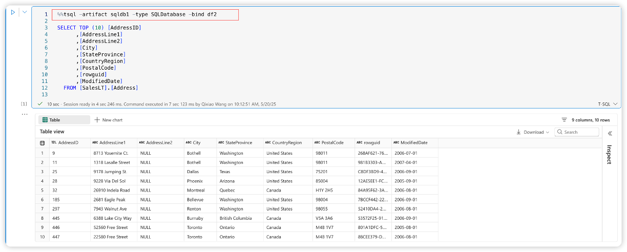 %%tsqlcomando magic, includere il parametro-sessionper stabilire il contesto di connessione. Per esempio:%%tsql -artifact ContosoDWH -type Warehouse -session SELECT TOP(10) * FROM [ContosoDWH].[dbo].[Geography];Usare le magiche di linea: dopo l'inizializzazione della sessione, è possibile usare