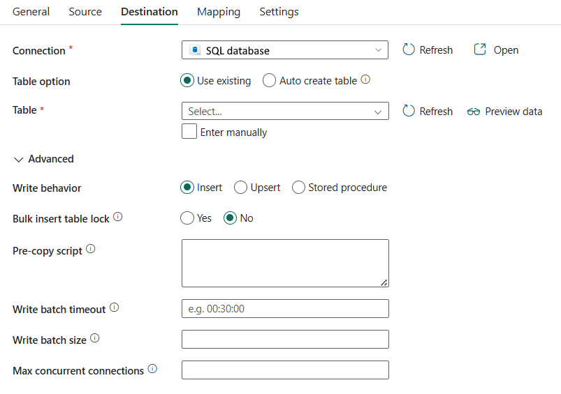 Dimensione del batch di scrittura: Specificare il numero di righe da inserire nella tabella SQL per batch. Il valore consentito è integer (numero di righe). Per impostazione predefinita, il servizio determina in modo dinamico le dimensioni del batch appropriate in base alle dimensioni della riga.