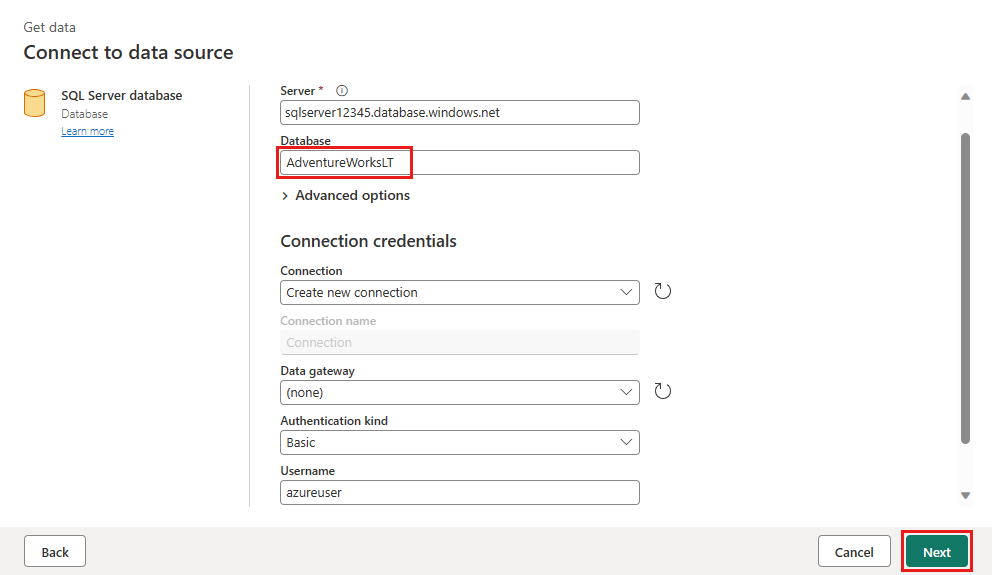Creare una connessione all'origine dati selezionando Crea nuova connessione. Immettere le informazioni di connessione necessarie nel pannello e immettere AdventureWorksLT per il database, in cui è stata generata la query di unione nel flusso di dati. Quindi seleziona Avanti.