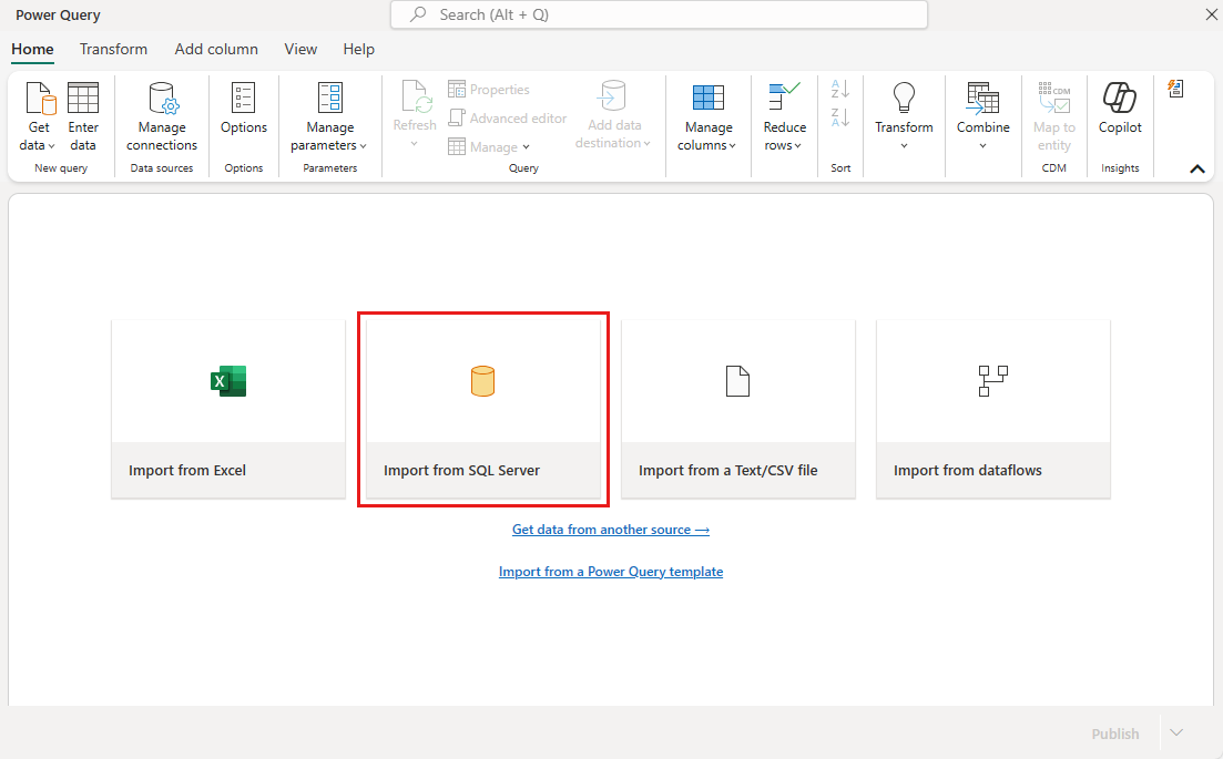Nell'editor del flusso di dati selezionare Importa da SQL Server.