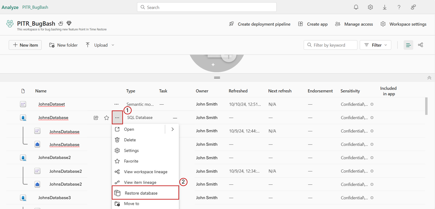 Puoi ripristinare un database in un punto nel tempo entro il periodo di conservazione. Eseguendo questa operazione, si sta effettivamente creando un nuovo database SQL in Fabric. Al termine del ripristino, Fabric crea un nuovo database nella stessa area di lavoro del database originale.