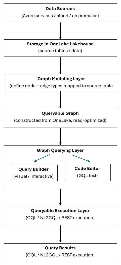 Graph in Microsoft Fabric trasforma i dati strutturati archiviati in OneLake in un grafo modellato e su cui è possibile eseguire query. Eseguire query sul grafico usando strumenti visivi o basati su GQL eseguiti tramite un motore comune per produrre risultati visivi, tabulari o programmatici.