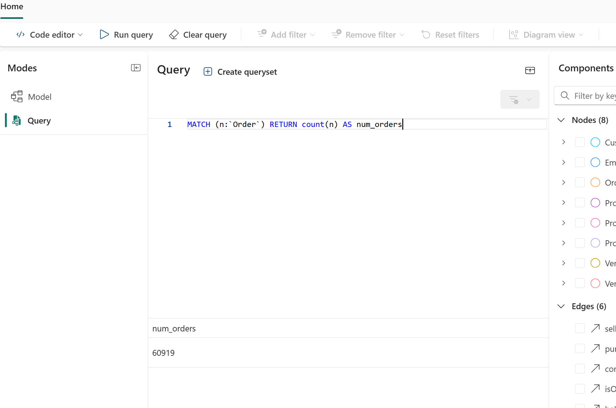 Questa query trova tutti i nodi con l'etichetta Order , li conta e restituisce il totale come num_orders. È un modo semplice per verificare che il grafico abbia dati e che il conteggio corrisponda al numero di righe di ordine caricate. L'immagine seguente mostra il risultato della query: