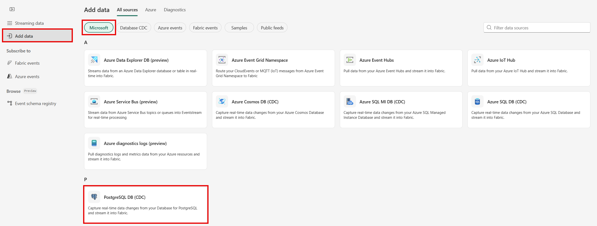 Nella pagina Origini dati selezionare la categoria Origini Microsoft nella parte superiore e quindi selezionare Connetti nel riquadro Database di Azure per PostgreSQL (CDC).
