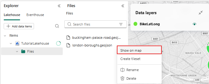 In TutorialLakehouse selezionare il file london-boroughs.geojson e fare clic con il pulsante destro del mouse sul file e scegliere Mostra sulla mappa. Ripetere il passaggio per buckingham-palace-road.json file.