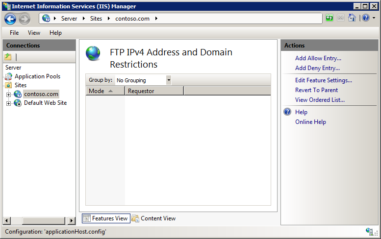 Nella funzionalità Ftp IPv4 Address and Domain Restrictions (Impostazioni indirizzo FTP IPv4 e restrizioni di dominio ) fare clic su Aggiungi voce consenti... o Aggiungi voce nega... nel riquadro Azioni .