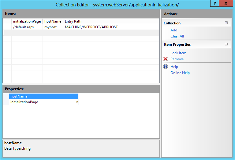 Nell'editor raccolta, per aggiungere un'applicazione da inizializzare, fare clic su Aggiungi, fare clic su hostName e quindi impostare hostName sul nome dell'host. Fare clic su inizializzazionePage e impostarlo su un URL per l'applicazione. Chiudere la finestra di dialogo.
