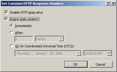Nella finestra di dialogo Imposta intestazioni di risposta HTTP comuni selezionare la casella per la scadenza del contenuto Web, selezionare Immediatamente e quindi fare clic su OK.