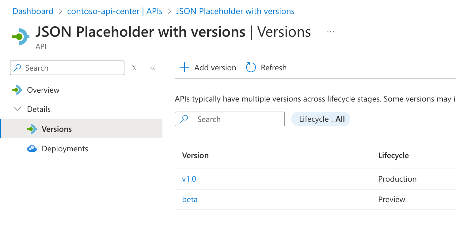 Prima di iniziare, creare un'istanza del Centro API di Azure e registrare le API usate nell'organizzazione. Per ogni API, definire le versioni usate e specificarne la fase del ciclo di vita.